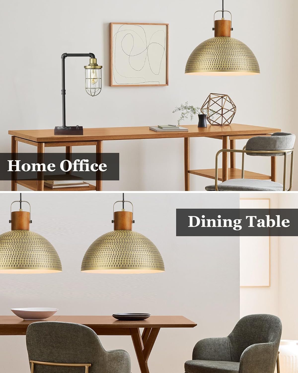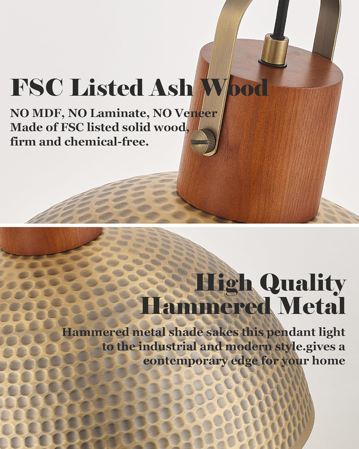 ELYONA 2 Pack Large Hammered Pendant Light Fixtures, 16 Inch Ash Wood Vintage Dome Hanging Lamp, Antique Gold Mid Century Pendant Lighting for Kitchen Island, Farmhouse, Dining Room, Brushed Brass