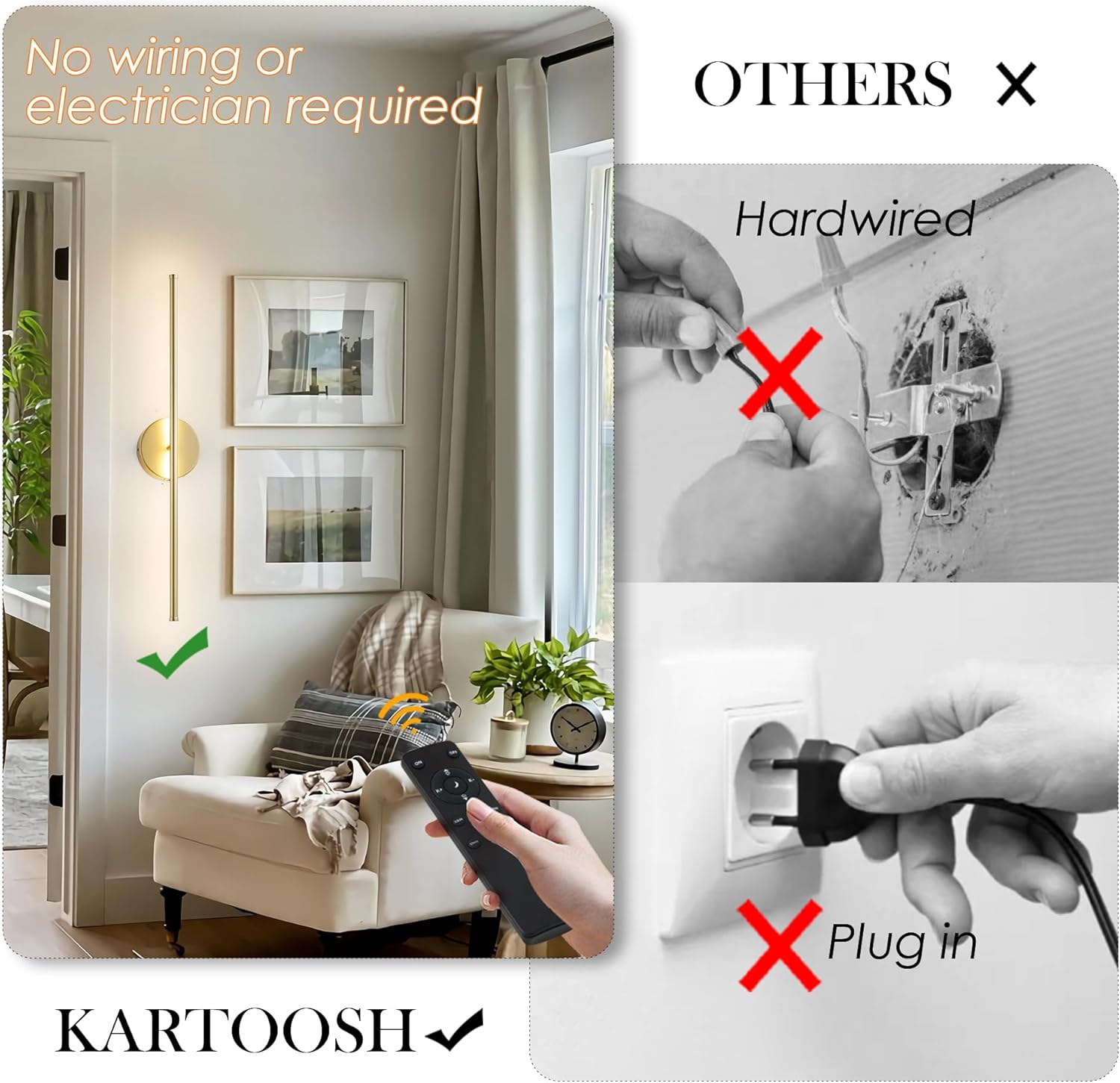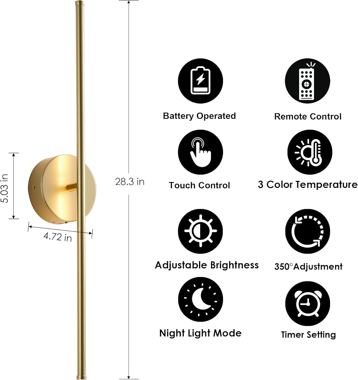 Removable Battery Operated Wall Sconces with Remote Control 350°Rotate LED Wireless Wall Lights with 3 Color Temperatures & Dimming for Bedroom, Hallway,28.3 Inch (2 Pack)